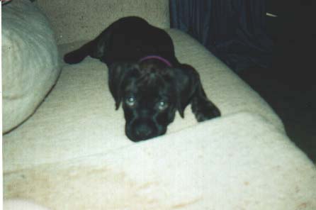 Don't they look cute? Those are my 2 babies, Rob and Gemina. Gemina is a Bullmastiff, Rottweiler, and Neapolitan Mastiff mix, and looks like a handful of pepper (brindle). She's only 10 weeks old and I got her on February 20th, 2000. My friend Tricia was fostering her after her original owner decided he didn't want her after all. I was looking for a puppy to keep me company during Rob's military deployments. Tricia thought of me when this little one came to stay with her. I hope to add more pictures of her to my site as she grows, so check back to see how big she gets. :-) She's gonna be huge. | |